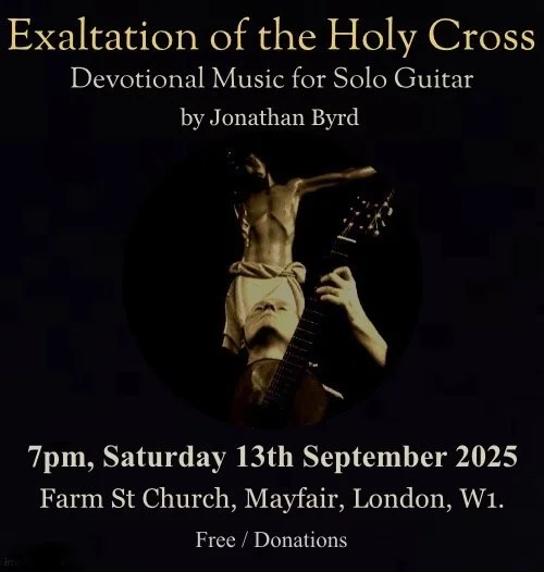 There will be a classical guitar concert in the church at 7pm on Saturday 13th September 2025. Rising star Jonathan Byrd is a classical guitarist and composer known for his sacred works for solo guitar. For the Exaltation of the Holy Cross, Jonathan is very grateful to be invited to Farm St Church to offer his ‘musical prayer’ Exaltatio Crucis, based on Psalm 30 ‘I will exalt thee, oh God’. Jonathan will also be providing music for the preceding Vigil Mass.